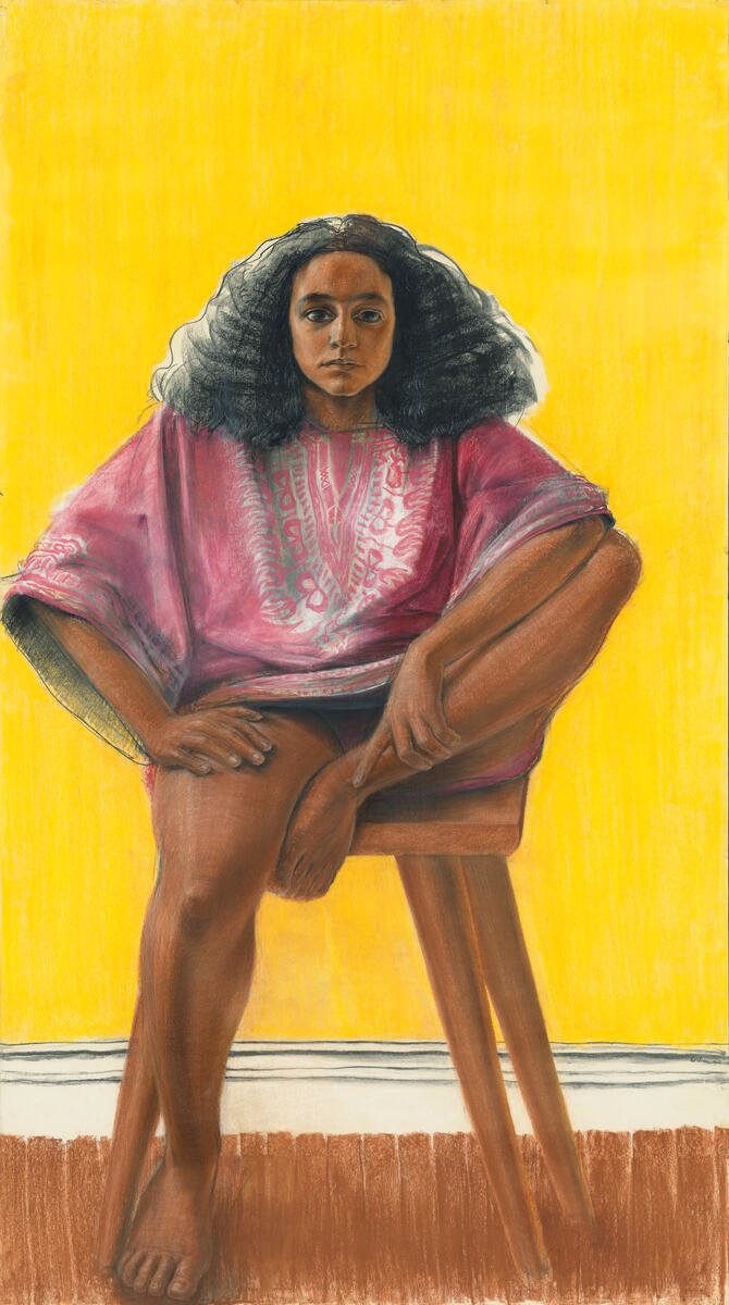 In the early 1970s Wilson's home in Brookline, Massachusetts, was the favorite hangout for his teenage children and their friends of all races, reflecting his interracial marriage and the progressive values the family upheld. This led to an idea for a mural, Young Americans, for which Wilson created a compositional sketch and individual life-size portrait studies of his children and their friends. Although the mural was never realized, these drawings stand as testament to what Wilson described as a hopeful moment in the early 1970s when greater racial harmony seemed within reach for his children's generation. Wilson saw that hope in notable Black political and cultural achievements, such as Shirley Chisolm's campaign for president, the establishment of the Congressional Black Caucus, the election of the first African American mayors in Newark, Los Angeles, and Detroit, and the first Pulitzer Prize for Drama awarded to an African American, Charles Gordone.