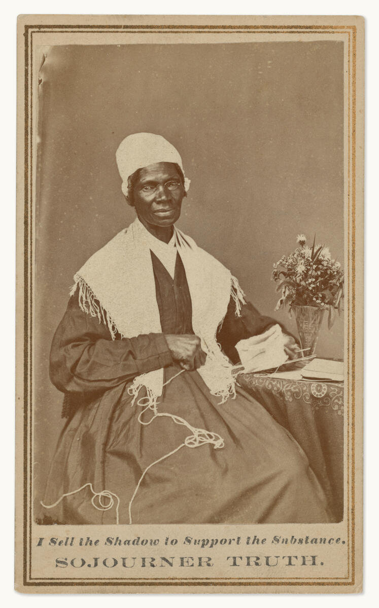 Sojourner Truth was an antislavery activist and speaker. She gave popular lectures sharing her story as a “runaway slave.” Truth sold cartes-de-visite like this one at those talks (and by mail) to support herself. She printed the photographs with the quote “I sell the shadow to support the substance.” Truth even had the cards copyrighted to ensure that only she could profit from her “shadow” or likeness.
